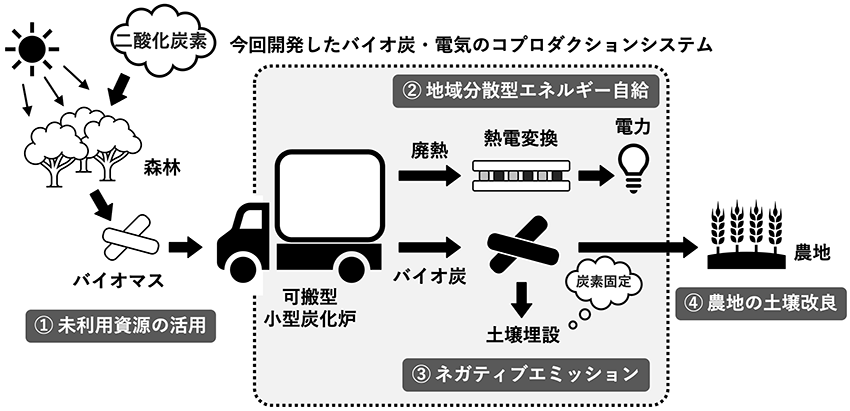 この装置は、山林や農地などのバイオマス発生現場に直接持ち込むことができ、バイオマスの輸送コストを抑えながら炭化処理を行える上、炭化の際に発生する熱エネルギーを利用して発電も可能にします。こうした特長から、、炭化プロセスの高度化による高品質な炭の製造に活用されると期待されます。また、こうして現場で炭化したバイオ炭を土壌に埋設することで炭素が長期的に固定されるとともに、土壌改良の効果を発揮します。