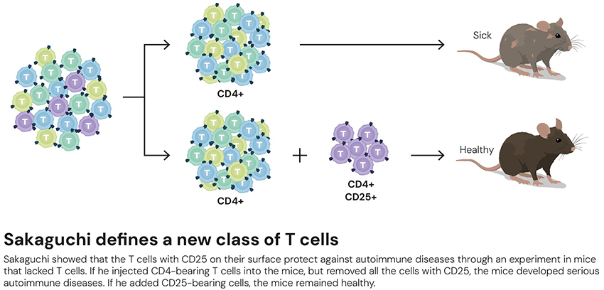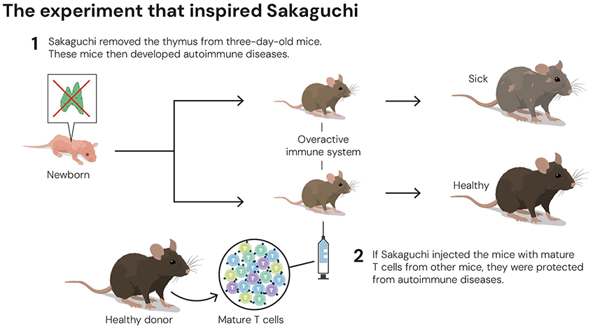 生後3日目のマウスから胸腺を摘出すると自己免疫疾患を発症するが、T細胞を移植すると発症しない(ノーベル財団プレスリリースより引用)