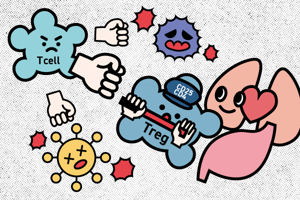 このように、免疫系には「自分の細胞(自己)は攻撃せず、自分以外の異物(非自己)は攻撃する」という、絶妙なバランスが要求されます。免疫系を担う免疫細胞のうち、T細胞と呼ばれるグループは胸腺という器官で成熟し、このときに自己を攻撃するT細胞は排除されます(T細胞のTは胸腺:Thymusに由来)。しかし実際には全ての自己攻撃性T細胞は排除されず、体全体を巡るようになり、何らかのきっかけで自己免疫疾患などの原因になると考えられています。