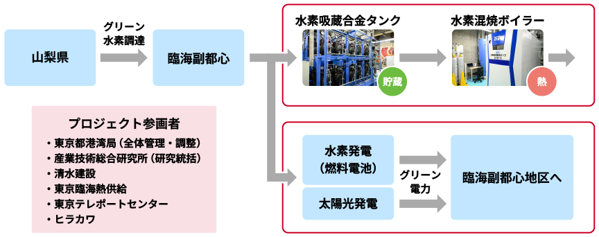 水素を活用し、臨海副都心の脱炭素化を促進するための共同研究のフローイメージ。
