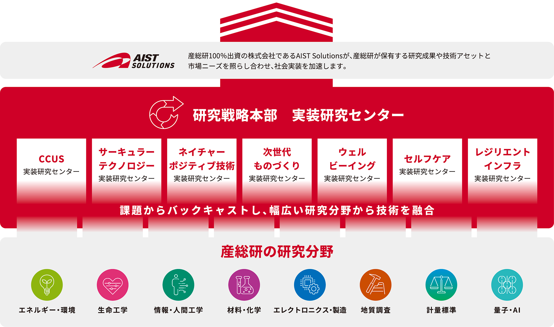 産業技術総合研究所は、社会課題の解決と産業競争力の強化を両立させる「実装研究」を推進しています。実装研究センターはその中核として、産総研の総合力を生かし、企業の皆さまとともに社会課題の解決と新たな市場の創出を目指す、共創の拠点です。各センターでは、3つの社会課題の解決に向けて、基盤技術の開発から実証、標準化、事業化に至るまで、一貫した取り組みを進めています。企業の皆さまには、研究開発から市場展開までを見据えた共創パートナーとして、産総研の専門家・設備・知的基盤をご活用いただけます。また、経営戦略に沿った研究テーマを設定できる冠ラボ(名称付き研究室)の設置を通じて、長期的かつ戦略的な技術開発を支援いたします。