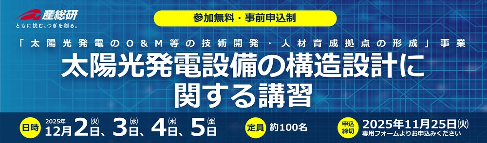 国立研究開発法人 産業技術総合研究所(以下、産総研)再生可能エネルギー研究センター 太陽光システム研究チームでは、福島県における再生可能エネルギーの導入促進のための支援事業費補助金「太陽光発電のO&M等の技術開発・人材育成拠点の形成」事業の一環として、産総研 福島再生可能エネルギー研究所(以下、FREA)に設置されている太陽光発電設備を活用し、オペレーション&メンテナンスの技術開発および人材育成を行っております。 本事業の一部として、太陽光発電設備の構造設計に関する講習を以下の要領で実施します。ふるってご参加ください。