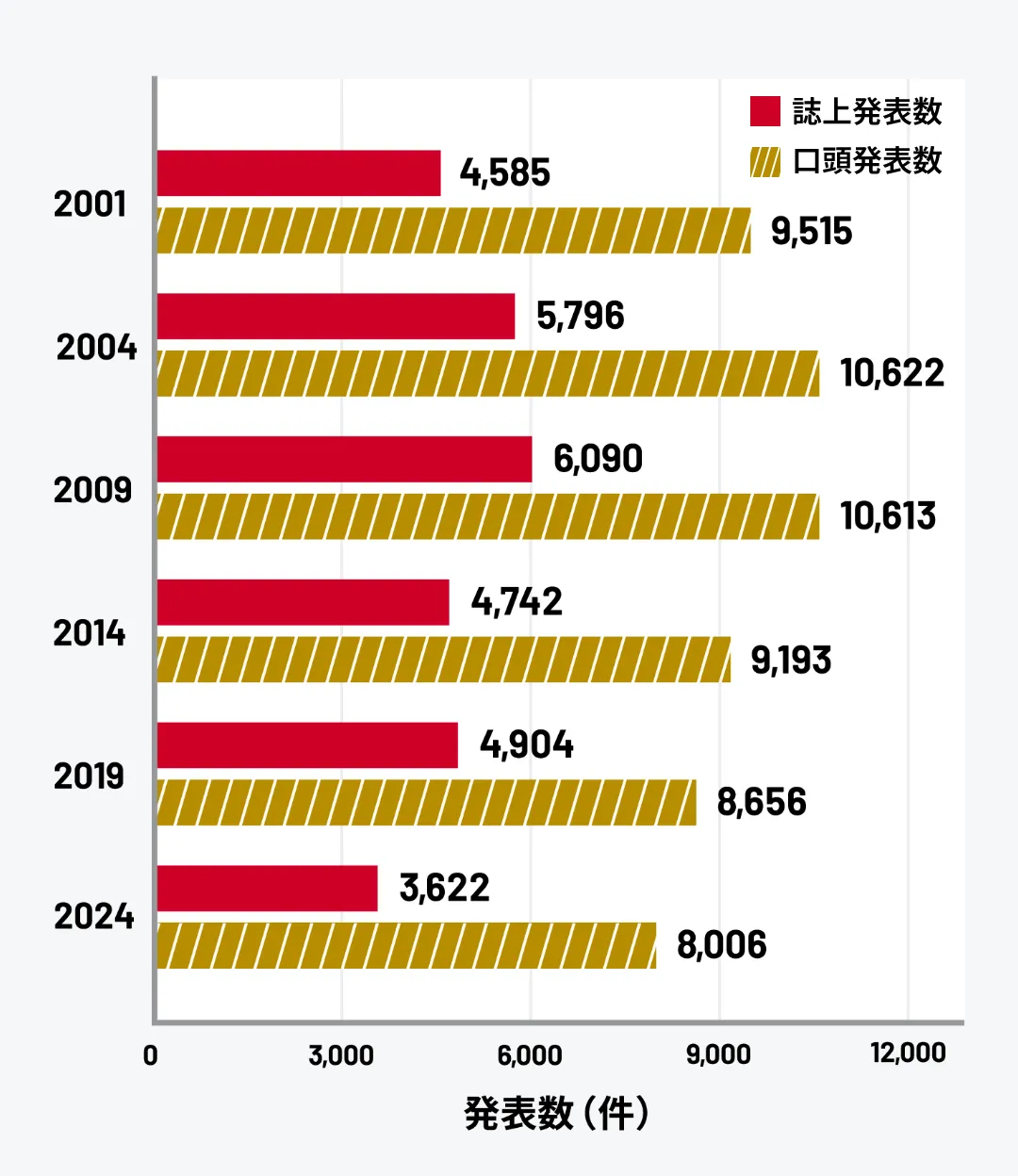 25年間で累計すると、誌上発表は約12万件、口頭発表は約23万件にのぼります。