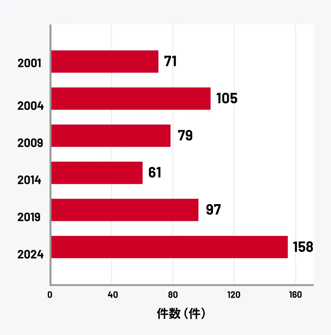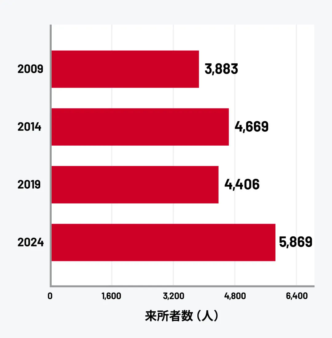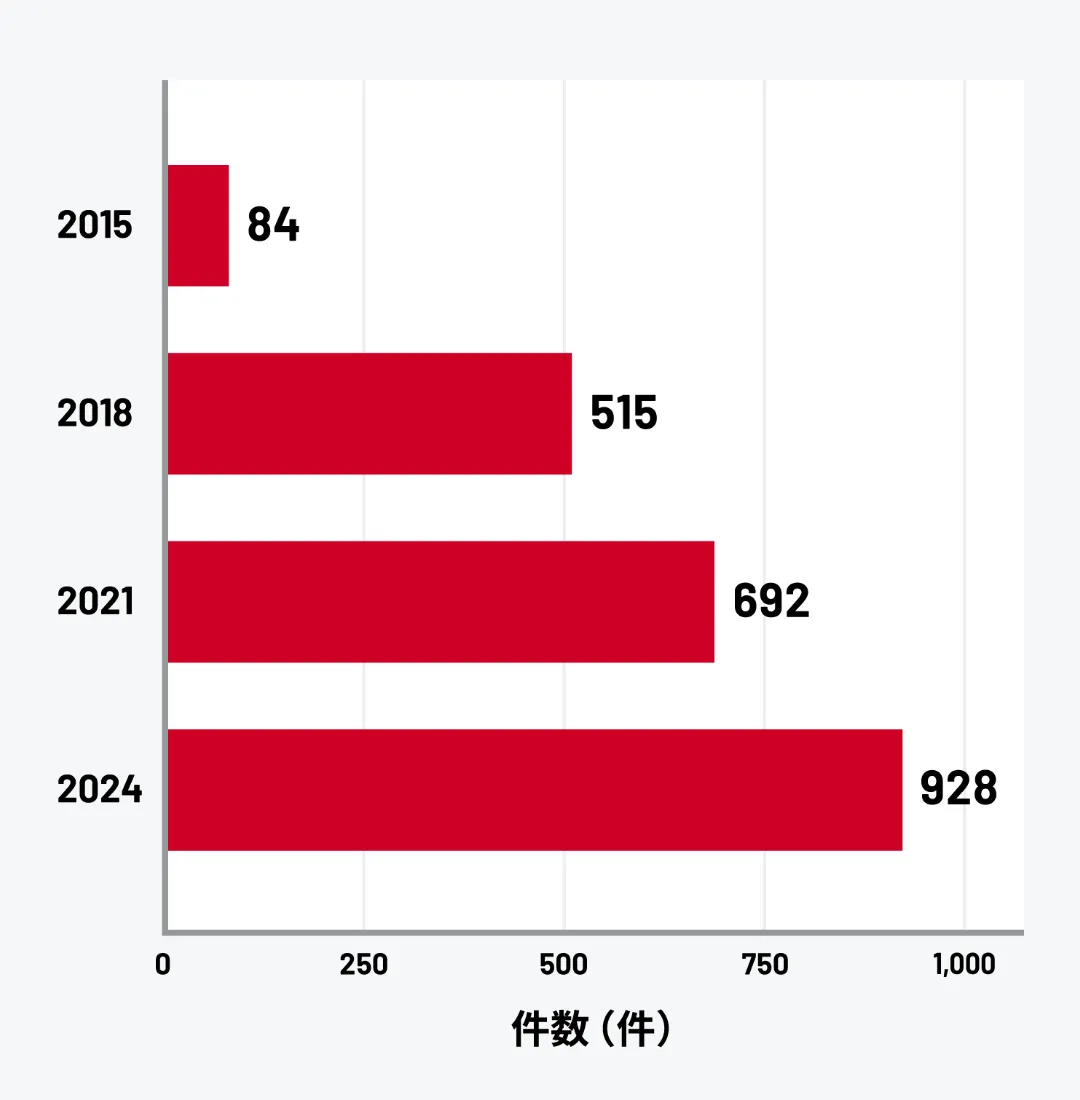 2014年の46人から2024年には452人と約10倍に急増しており、