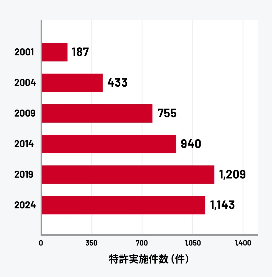 特許実施は、研究成果が実際に社会で使われている証です。産総研の特許実施件数は25年間で187件から1,000件超へと増加し、企業とのライセンス契約を通じて製品化・サービス化が進んでいます。