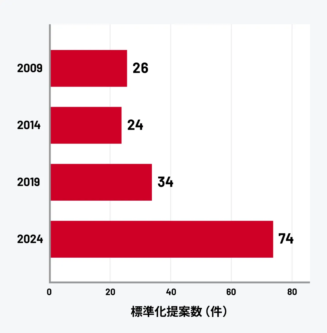 また、国際標準化提案も近年大きく伸びており、2024年には74件を記録。グローバルな産業基盤を作る上で、産総研の技術が世界のルールづくりに貢献しています。