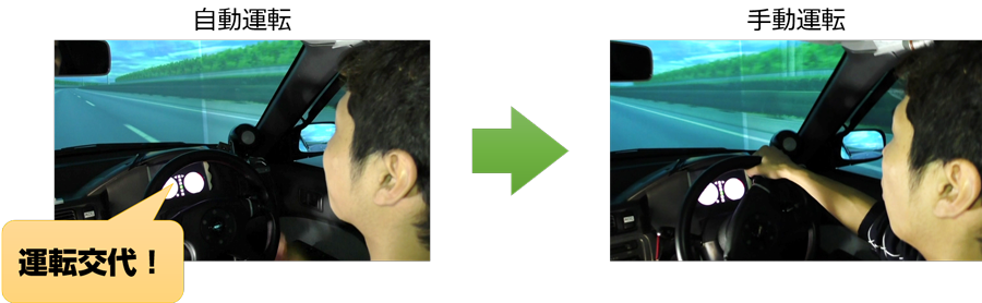 走っている途中で運転交代するなんて危ないと思われるかもしれません。しかし、運転交代するたびに、毎回クルマをいったん止めていたのでは、道の中でのクルマの流れが悪くなってしまいます。走りながらでも運転交代するためには、ドライバーが運転を交代できる状態にあるかどうかを自動運転システム側が把握して、運転交代できない状態になった場合には、その状態から運転できる状態に戻すように働きかける仕組みが重要となります。