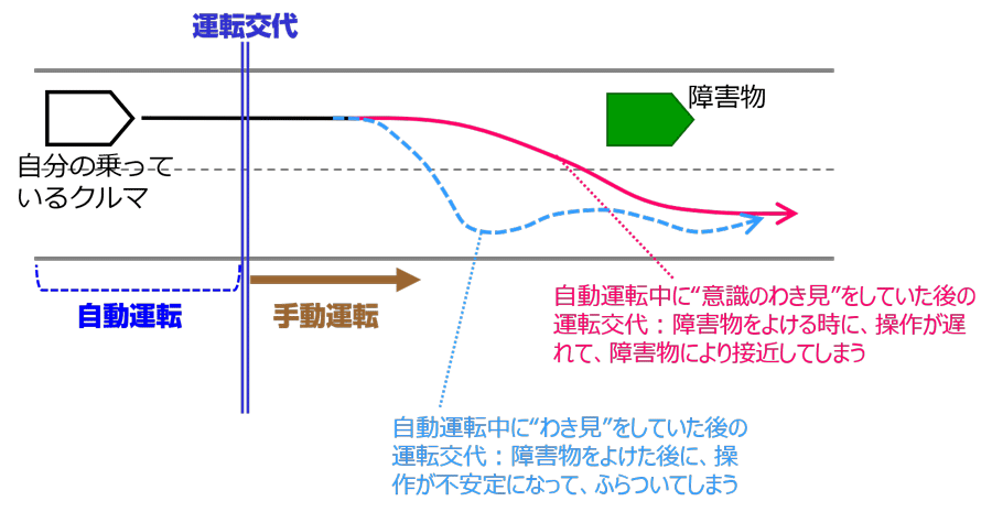 具体的には、自動運転中に意識のわき見をしていると、運転交代した後、障害物を回避する場合に、回避操作に遅れが見られ、障害物により接近して回避することになってしまうこと、また、自動運転中にわき見をしていると、運転交代した後、障害物を回避した後にクルマがふらついてしまうことが分かってきました。自動運転中にドライバーのやっていることが違うというのは、脳の活動や身体の準備状態も異なりますので、手動運転に切り替わってからの運転行動にも違いが出てしまうようです。