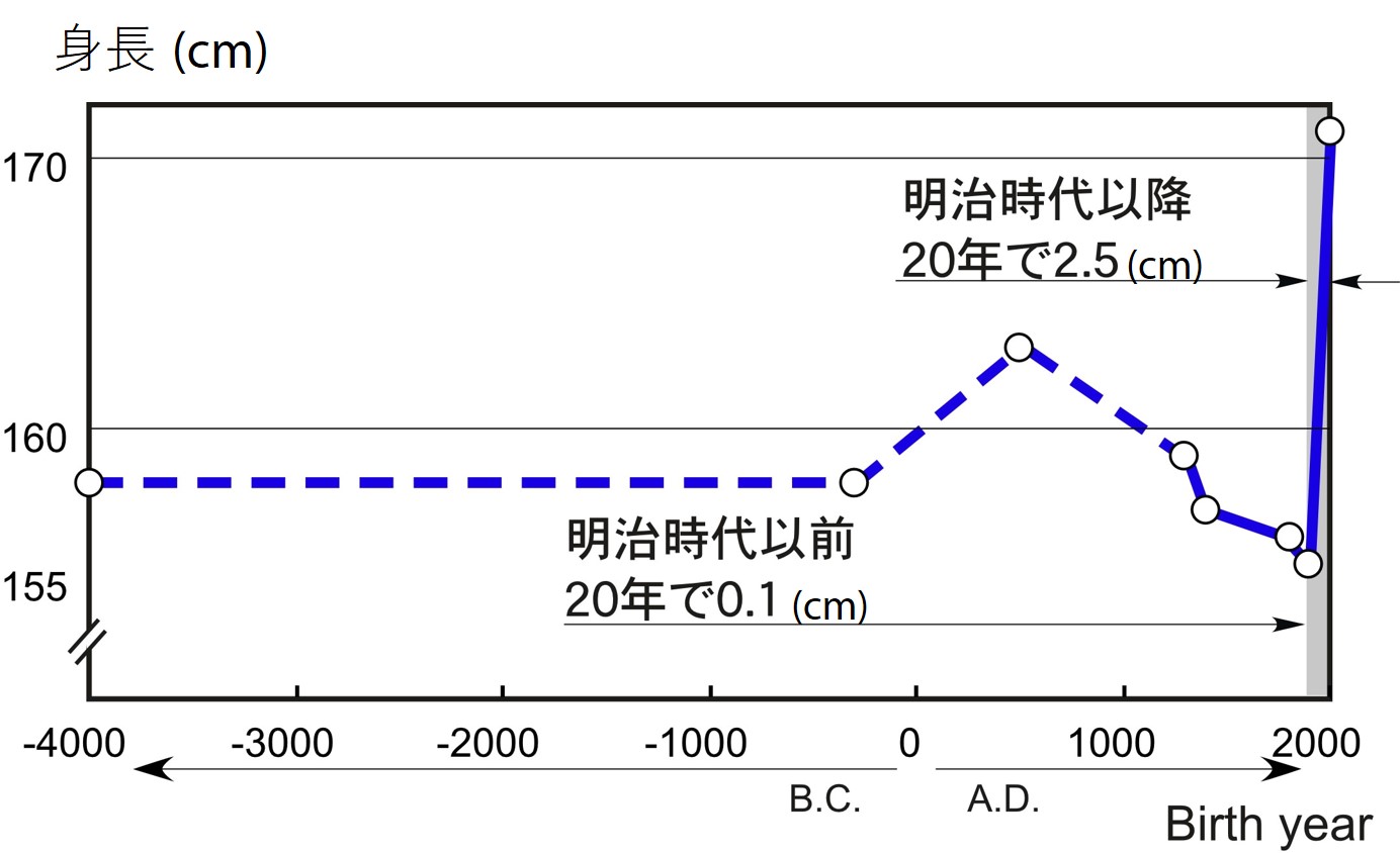 80年前に生まれた方と20年前に生まれた方では、平均身長が大きく違います。そして、それは縄文時代から江戸時代の間のように時代変化が小さかった頃には、あまり目立ちませんでした。いま、お年寄りが背が低いのは、年をとって背が低くなったのではなく、80年前に生まれた人々はそういう身長だったのです。