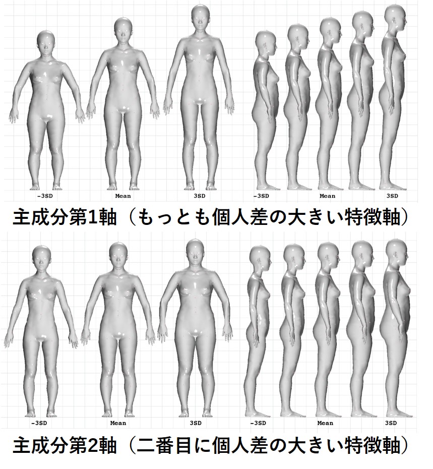 そのようなたくさんのデジタルヒューマンモデルを統計処理すると、日本人の身体のかたちの違いを表す特徴軸というのが見つかりました。全身形状であれば、もっとも個人差が大きく現れるのは身長と関係した身体のかたちの変化で、次に大きく現れるのは太り痩せを表すような変化であることがわかったんです。