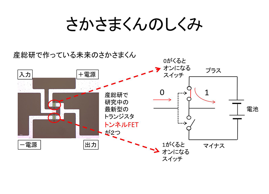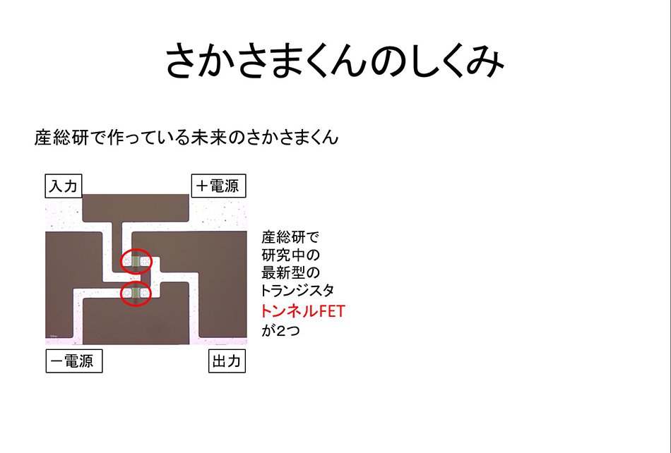 下の写真は、産総研で研究している、未来のさかさまくん1つ分を拡大したものです。(一般公開の会場に来てもらえば、顕微鏡をのぞいて実物を見ることができます。)この赤い部分には、産総研で研究中の最新型のトランジスタであるトンネルFETが2つ並んでいます。