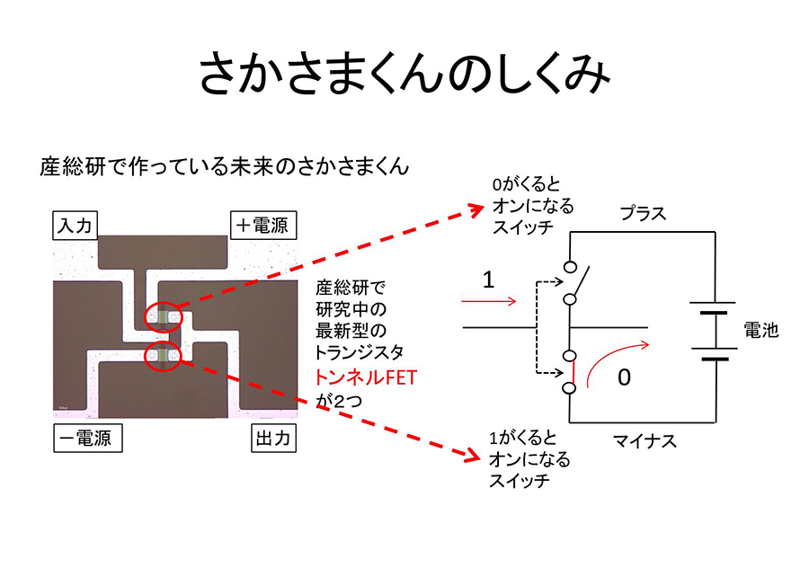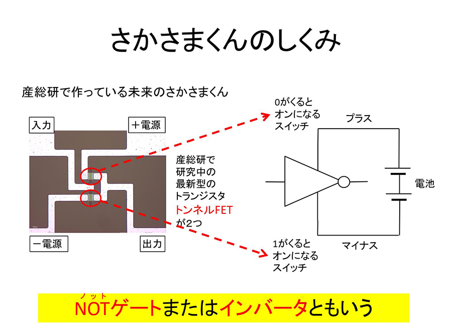 コンピュータの心臓部の半導体LSIのなかには、0と1のデータをやり取りする部品がぎっしり詰まっています。その中で一番簡単な、小さな小さな部品、それが、このさかさまくんです。