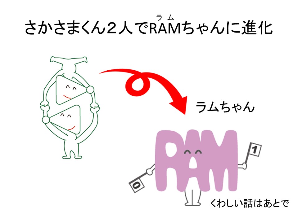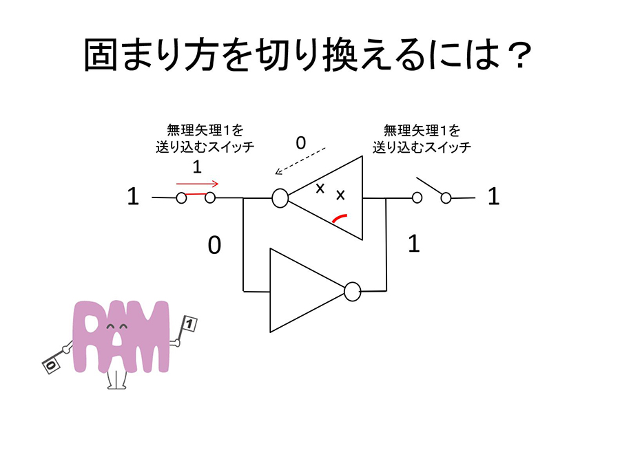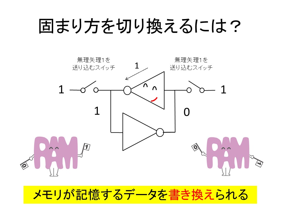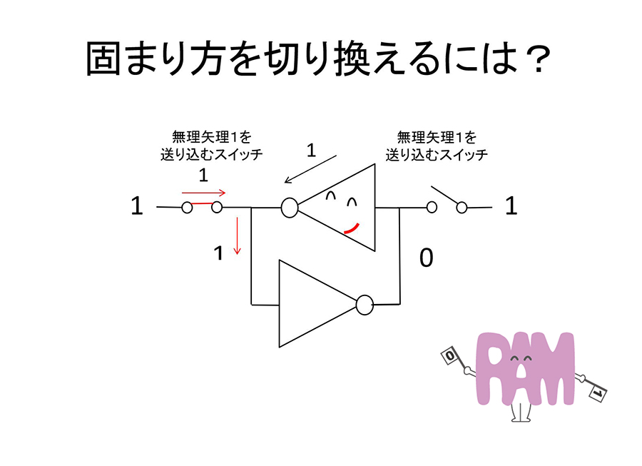 こうして、ラムちゃんは、最初の固まり方とは違う、もう一つの固まり方に入れ替わることができました。このようにスイッチを追加することで、メモリが記憶するデータを書き換えることができるようになります。