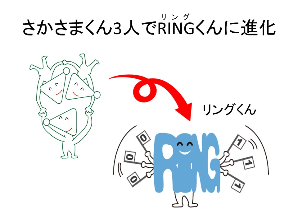 いっぽう、さかさまくん3人が合体すると、このようにリングくんに進化します。